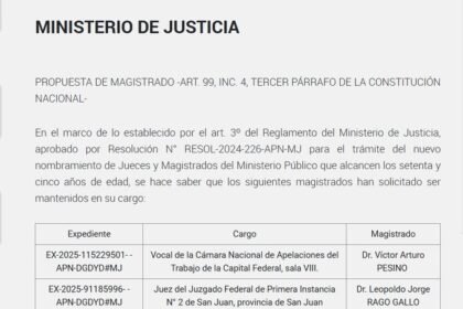 El Gobierno inició el trámite de nuevo acuerdo para que continúen dos jueces de 75 años. Se trata de Rago Gallo del Juzgado de San Juan y Pesino de la…