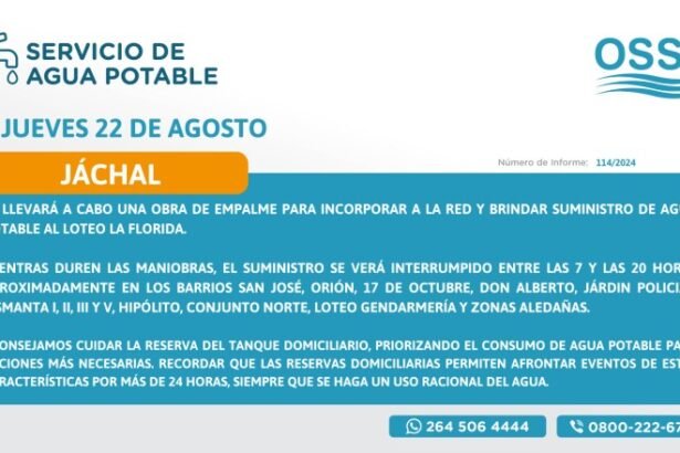 Obras Sanitarias informa que este jueves 22 de agosto, llevará a cabo una obra de empalme para incorporar a la red y brindar suministro de agua potable al Loteo La Florida, en Jáchal.