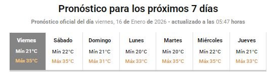 Según el ServiSegún lo que indica el Servicio Meteorológico Nacional, para este viernes 16 de enero de 2026, se espera en San Juan que la máxima alcance los 35°C, en tanto que la mínima está pronosticada en 21°C.