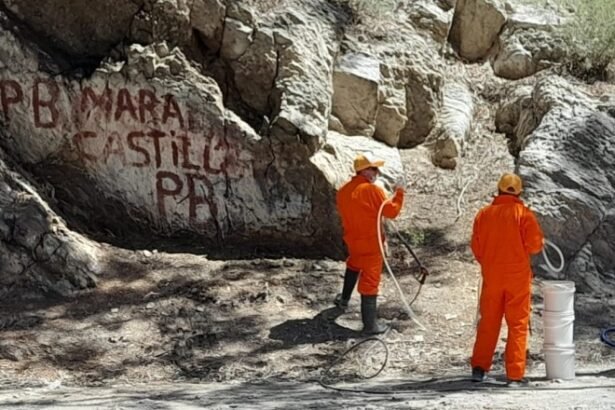 Para ello durante el lunes 13 y el martes 14 de octubre, se realiza la primera etapa de la tarea de arenado de los grafitis en la roca para restaurar la formación geológica Laja en la montaña, con la colaboración voluntaria de la Fundación Pro-Montaña de la Provincia de Mendoza, y ONGs de San Juan.