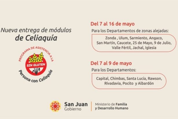 El Ministerio de Familia y Desarrollo Humano informa que durante el mes de mayo se llevará a cabo la entrega de módulos alimentarios destinados a personas celíacas. Esta acción se enmarca en el programa de asistencia nutricional que busca garantizar el acceso a alimentos libres de gluten, en cumplimiento con las políticas públicas orientadas a la inclusión y el cuidado de la salud.
