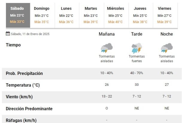 El Servicio Meteorológico Nacional informó que para este sábado 11 de enero de 2025 se espera que la máxima ascienda hasta los 33°C mientras que la mínima fue de 23°C.