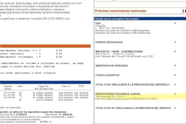 Se trata de una tasa municipal que encarece alrededor de un 10% el costo del gas, a la que se suma un adicional del 4% que cobra la provincia de Buenos Aires para financiar un fondo especial destinado a obras de gas, creado por la ley provincial 8474. La mención a la “manda judicial” indica que el cobro cuenta con respaldo de una resolución judicial que habilita explícitamente su inclusión en la factura.