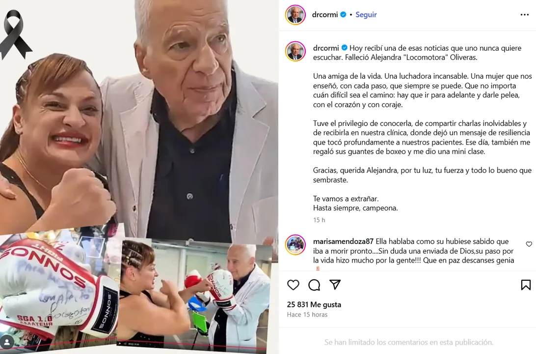 El Dr. Alberto Cormillot le dedicó una sentida carta abierta a la boxeadora, junto a una imagen de ambos abrazados: «Hoy recibí una de esas noticias que uno nunca quiere escuchar. Falleció Alejandra «Locomotora» Oliveras. Una amiga de la vida. Una luchadora incansable. Una mujer que nos enseñó, con cada paso, que siempre se puede. Que no importa cuán difícil sea el camino: hay que ir para adelante y darle pelea, con el corazón y con coraje».