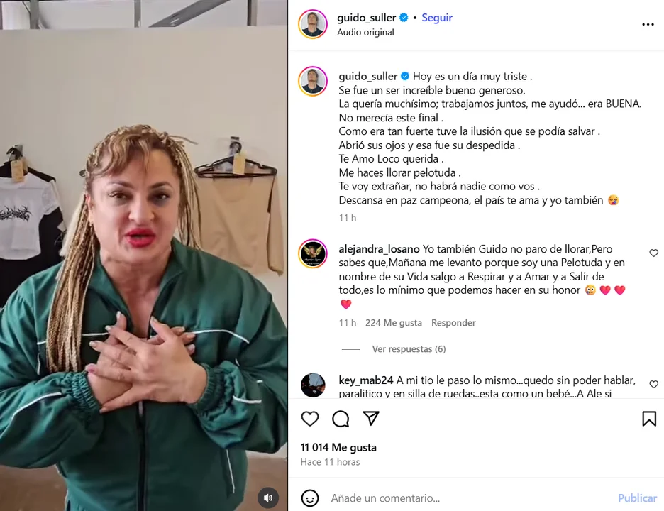 El mediático Guido Süller le dedicó unas dulces palabras a la Locomotora y manifestó su tristeza ante la situación: «Hoy es un día muy triste. Se fue un ser increíble, bueno, generoso. La quería muchísimo; trabajamos juntos, me ayudó… era BUENA. No merecía este final. Como era tan fuerte tuve la ilusión que se podía salvar. Abrió sus ojos y esa fue su despedida. Te Amo Loco querida. Me haces llorar pelotuda. Te voy extrañar, no habrá nadie como vos. Descansa en paz campeona, el país te ama y yo también 😪».