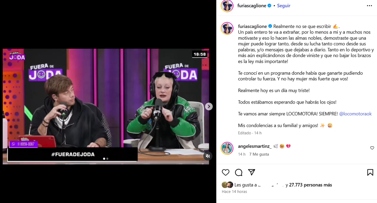 “Te conocí en un programa donde había que ganarte pudiendo controlar tu fuerza. Y no hay mujer más fuerte que vos! Realmente hoy es un día muy triste! Todos estábamos esperando que habrás los ojos! Te vamos amar siempre LOCOMOTORA! SIEMPRE! @locomotoraokMis condolencias a su familia! y amigos!”, cerró.