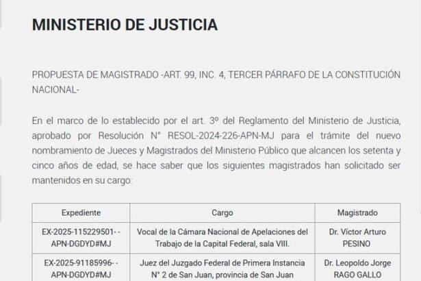 El Gobierno inició el trámite de nuevo acuerdo para que continúen dos jueces de 75 años. Se trata de Rago Gallo del Juzgado de San Juan y Pesino de la Cámara del Trabajo, uno de los jueces que ayer dispuso modificar el efecto del recurso en la causa CGT por la reforma laboral.