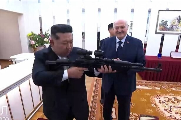 “¡Por si aparecen enemigos!”, bromeó Lukashenko, provocando las risas de Kim, que examinó el arma con interés y probó el mecanismo de recarga. A cambio, el líder norcoreano le regaló a su invitado un jarrón hecho de proyectiles, con una imagen incrustada de Lukashenko.