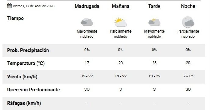el calor aún no se retira. Para este viernes 17 de abril de 2026, se espera una jornada estable, con cielo mayormente nublado y temperaturas que alcanzarán los 28°C durante la tarde, según el Servicio Meteorológico Nacional (SMN).