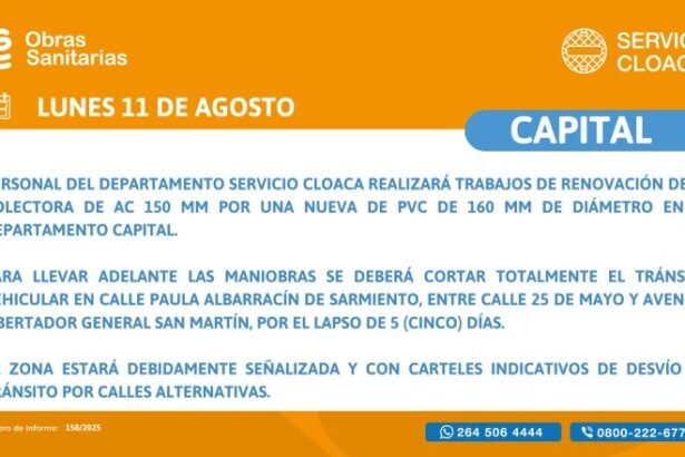 Personal del Departamento de Servicio Cloaca de Obras Sanitarias comenzará una renovación de la red colectora de AC 150 mm por una nueva de PVC de 160 mm. Para llevar adelante estas maniobras, se deberá cortar totalmente el tránsito vehicular en calle Paula Albarracín de Sarmiento, entre calle 25 de Mayo y Avenida Libertador General san Martín, por el lapso de 5 cinco días, a partir de este lunes 11 de agosto.