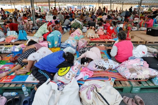 Los evacuados tuvieron que lidiar con el reasentamiento fuera de las zonas de peligro. Un refugio de evacuación en la universidad de Surin, Tailandia, albergaba a más de 3600 personas.