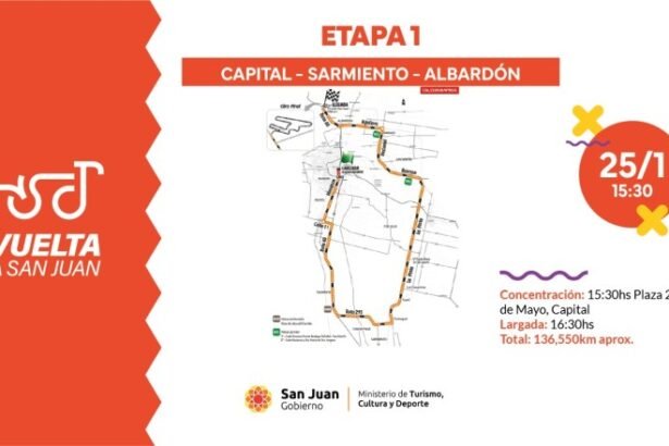 Recorrido: en tren controlado por calle Mendoza al sur hasta Avenida Circunvalación (2 KM aprox.). Kilómetro 0 en Avenida Mendoza y Av. Circunvalación. Vía libre por calle Mendoza hacia el sur transitando el Dpto Rawson hasta empalmar Av. Uñac (Dpto Pocito), continuar hasta Calle 11 donde se gira al este hasta Ruta 40. Al sur hasta Ruta 295 donde se gira al este hasta calle La Plata (Dpto Sarmiento), al norte hasta calle Rawson (Dpto San Martín), continuar hasta empalmar calle Nacional y girar en la rotonda hacia el oeste por calle Aguilera (Dpto Angaco), ingresar al Dpto Albardón, calle Sarmiento hasta Ruta 40, al norte hasta ingresar al Circuito San Juan Villicum y llegar a Línea de Meta.