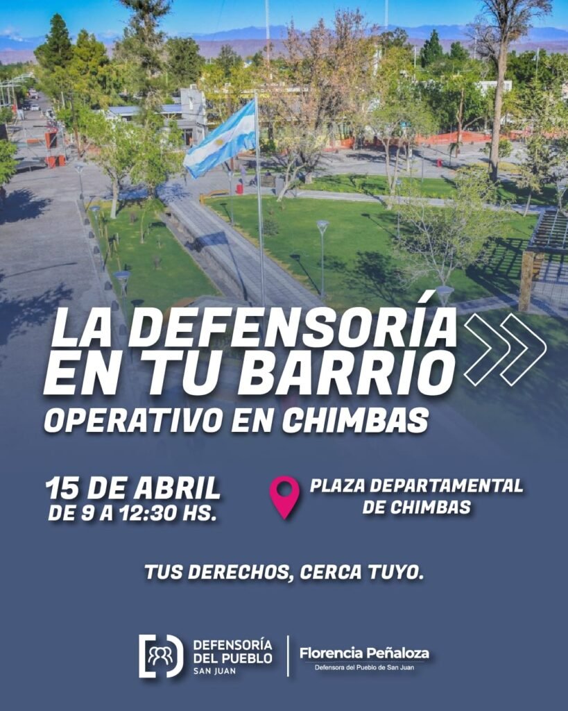 El operativo «La Defensoría en Tu Barrio» se realizará el 15 de abril de 9 a 12:30 en la Plaza Departamental de Chimbas. La atención es gratuita, confidencial y abierta a toda la comunidad