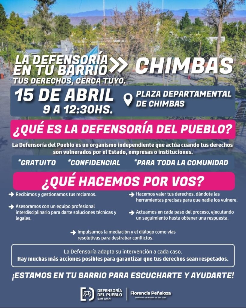 La Defensoría del Pueblo de San Juan, a cargo de la Dra. Florencia Peñaloza, se instalará este miércoles 15 de abril en la Plaza Departamental de Chimbas en el marco del programa «La Defensoría en Tu Barrio». La actividad se desarrollará de 9 a 12:30 horas y contará con la presencia de un equipo profesional interdisciplinario para atender consultas y reclamos de los vecinos y vecinas del departamento.
