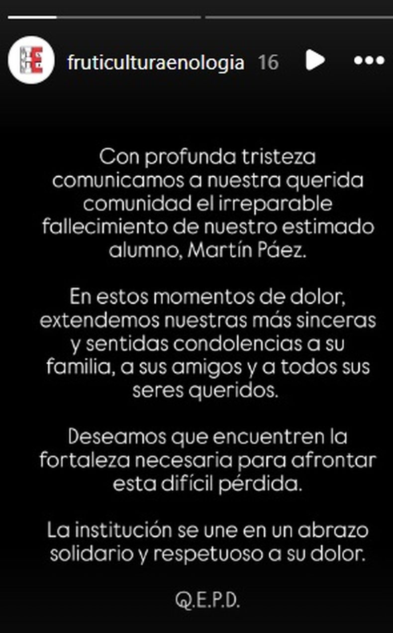 La Escuela de Fruticultura y Enología de San Juan se encuentra de luto tras la trágica muerte de Martín Páez, un alumno de la institución, quien perdió la vida el fin de semana cuando un arco de fútbol cayó sobre él en el camping del Círculo de Oficiales de la Policía de San Juan, ubicado en Rawson.