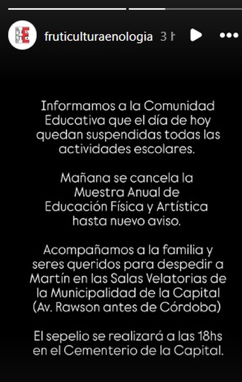 En un comunicado difundido este lunes, la escuela informó que quedan suspendidas todas las actividades escolares y que la Muestra Anual de Educación Física y Artística programada para mañana queda cancelada hasta nuevo aviso. Asimismo, expresaron sus condolencias a la familia y seres queridos del niño y comunicaron que el sepelio se realizará a las 18 horas en el Cementerio de la Capital.