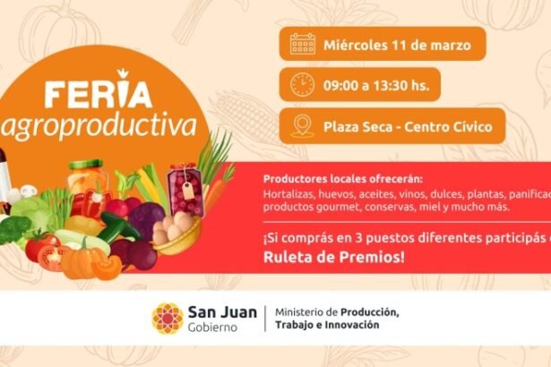 Este miércoles 11 de marzo, la Plaza Seca del Centro Cívico será nuevamente el punto de encuentro de la Feria Agroproductiva, que reunirá a productores y emprendedores sanjuaninos de 9 a 13:30 hs. La propuesta incluye una amplia variedad de productos regionales, venta directa al público y la tradicional ruleta de premios para quienes realicen compras en diferentes puestos.
