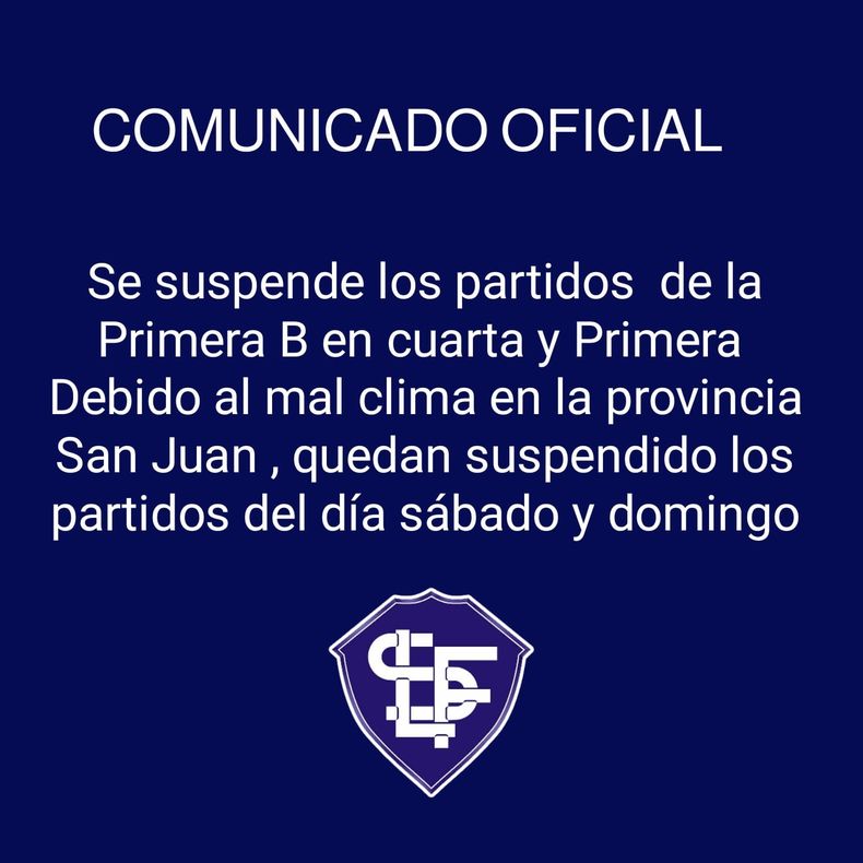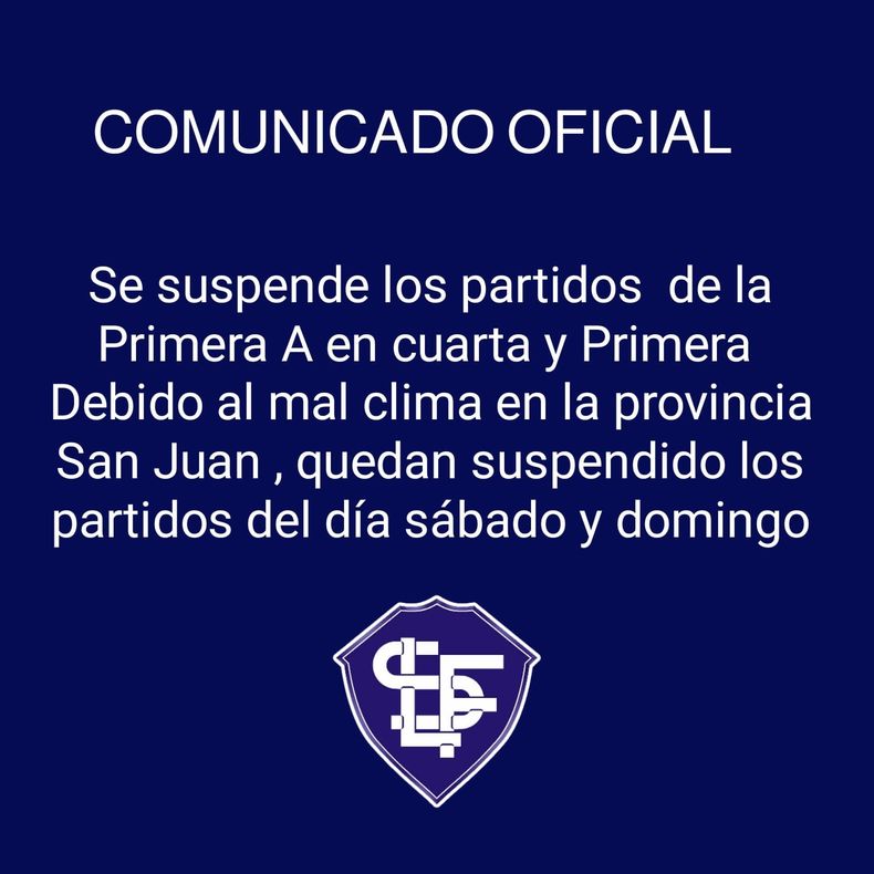 El mal tiempo en la provincia obligó a la Liga Sanjuanina de Fútbol a suspender la actividad prevista para este fin de semana. Según se comunicó oficialmente, la medida afecta a los partidos de Primera A y Primera B, tanto en cuarta como en primera división, que estaban programados para los días sábado y domingo.