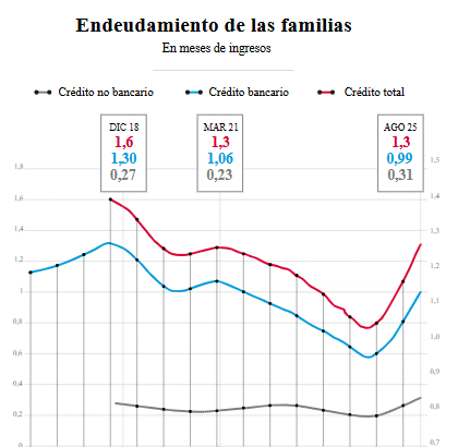 Según datos del Banco Central y EcoGo, un hogar promedio acumula deudas equivalentes a 1,3 veces su ingreso mensual, el nivel más alto desde la pandemia. – El 16,5% del crédito no bancario está en mora. – El aumento del endeudamiento se concentra en las tarjetas de crédito.