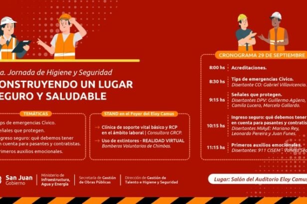 La Dirección de Gestión de Talento e Higiene y Seguridad, del Ministerio de Infraestructura, Agua y Energía, invita a la comunidad a participar en la 4.ª Jornada de Higiene y Seguridad en el Trabajo: “Construyendo un lugar seguro y saludable”. Este espacio busca fortalecer la cultura de la prevención mediante capacitaciones y charlas abiertas a trabajadores y público en general.