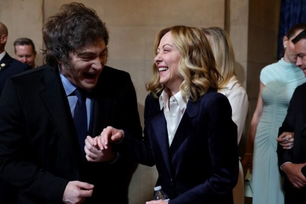 A poco de arribar, al líder libertario se lo vio charlando animadamente y sonriendo con otra invitada especial de Trump, la primer ministra italiana Georgia Meloni.