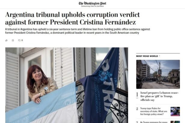 «Un tribunal argentino mantiene la sentencia por corrupción contra la ex presidenta Cristina Fernández», tituló en la tarde del miércoles The Washington Post sobre la ratificación de la condena a la actual presidenta del Partido Justicialista. Y en el artículo avanza: «La líder dominante de Argentina de este siglo fue acusada de direccionar contratos de obra pública hacia un magnate relacionado con su familia». Magnate quiere decir Lázaro Báez, también con condena ahora firme.