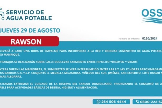 Obras Sanitarias informa que este jueves 29 de agosto, llevará a cabo una obra de empalme para incorporar a la red y brindar suministro de agua potable al Loteo Manrique en el Departamento de Rawson.