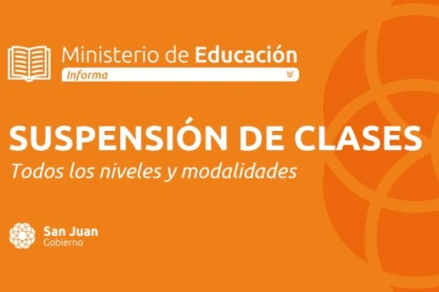 Ante el alerta meteorológica por vientos fuertes emitida por el Servicio Meteorológico Nacional y por recomendación de Protección Civil de la provincia; el Ministerio de Educación informa que se suspende la actividad escolar de este viernes 26 de septiembre en los departamentos Jáchal, Iglesia y Calingasta en los turnos tarde, vespertino y noche. Por su parte, la suspensión alcanzará al resto de la provincia pero en los turnos vespertino y nocturno, en todos los niveles y modalidades.