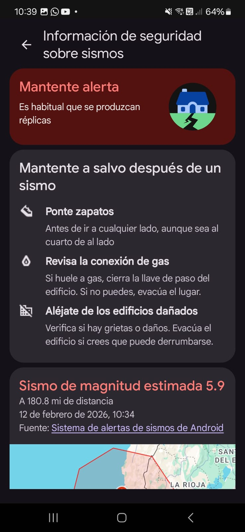 Segundos antes de percibirse el movimiento, varios usuarios reportaron haber recibido una alerta automática de Google en sus teléfonos celulares. El aviso advertía “mantente en alerta” y brindaba una serie de recomendaciones preventivas, como colocarse zapatos para evitar lesiones con vidrios u objetos cortantes, revisar posibles pérdidas en las conexiones de gas y mantenerse alejado de edificios que pudieran haber sufrido daños estructurales.