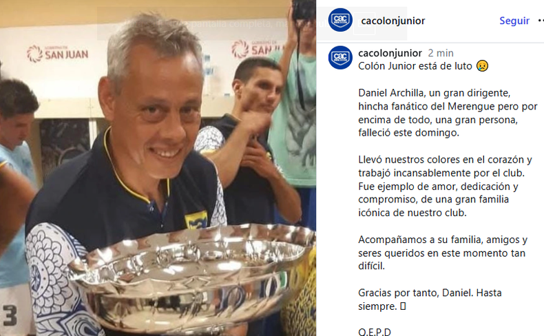 El club Colón Junior expresó públicamente su pesar a través de las redes sociales, donde confirmó el fallecimiento de Daniel Archilla y lo recordó como un dirigente comprometido y una figura muy querida dentro de la institución, acompañando a su familia y seres queridos en este momento de profundo dolor.
