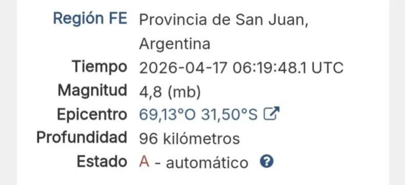 Según la aplicación Detector, el sismo alcanzó una magnitud de 4.8 y tuvo una profundidad de 96 kilómetros. En tanto, el Centro Sismológico Internacional (CSEM-EMSC) informó que la magnitud fue de 4.9, con epicentro a 61 kilómetros al oeste de la capital sanjuanina y a 28 kilómetros de Calingasta, y una profundidad estimada de 111 kilómetros.