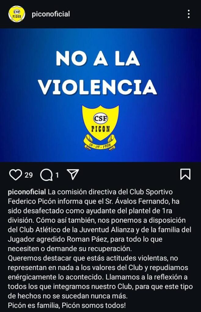 Los piconinos destacaron que: «estas actitudes violentas no representan en nada a los valores del Club y repudiamos enérgicamente lo acontecido. Llamamos a la reflexión a todos los que integramos nuestro Club, para que este tipo de hechos no se sucedan nunca más». «Picón es familia, Picón somos todos!», concluyeron.